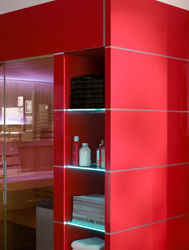 - Premium Dekorverkleidung vorne und eine Seitenwand in Hochglanz mit Alu, inklusive integrierter LED-Glasregale wahlweise in Rot, Schwarz oder Weiß