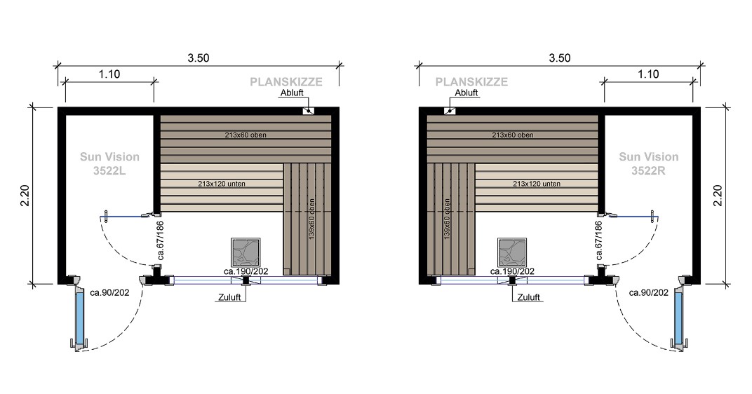 - Türen: Ca. 90/200 voll isolierverglast mit Dichtungsprofil Griff und Schloss. Saunatür 8 mm ESG Sicherheitsganzglastür mit Türdichtung und Stangentürgriff