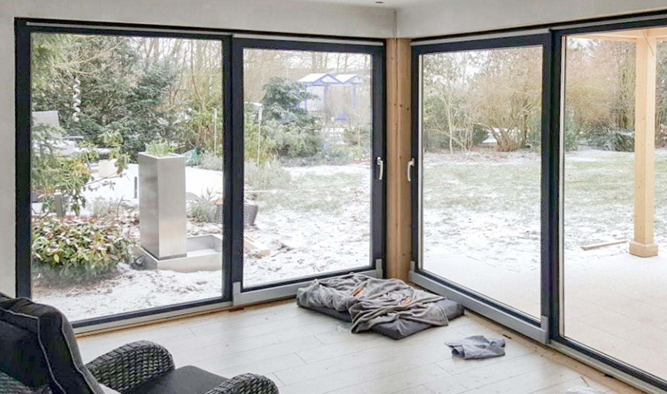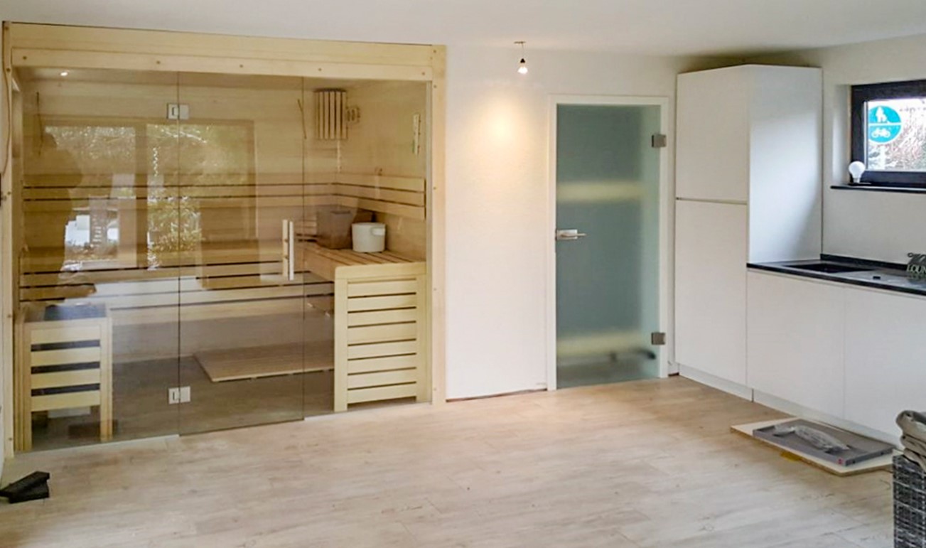 Türen: Außentür Kunststoff 2-fach isolierverglast, außen Anthrazit oder Weiß, innen in Weiß. Hebe-Schiebetür ca. 3,57 m x 2,10 m mit Griff und Schloss. Saunatür 10 mm ESG Glasfront mit schwellenloser Tür und Stangentürgriff Holz/Edelstahl.