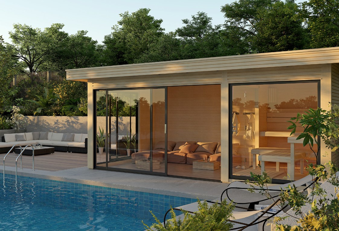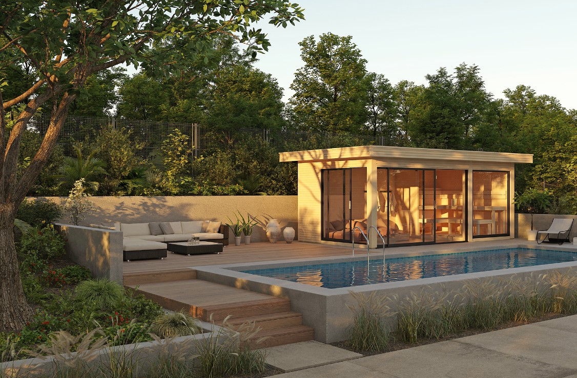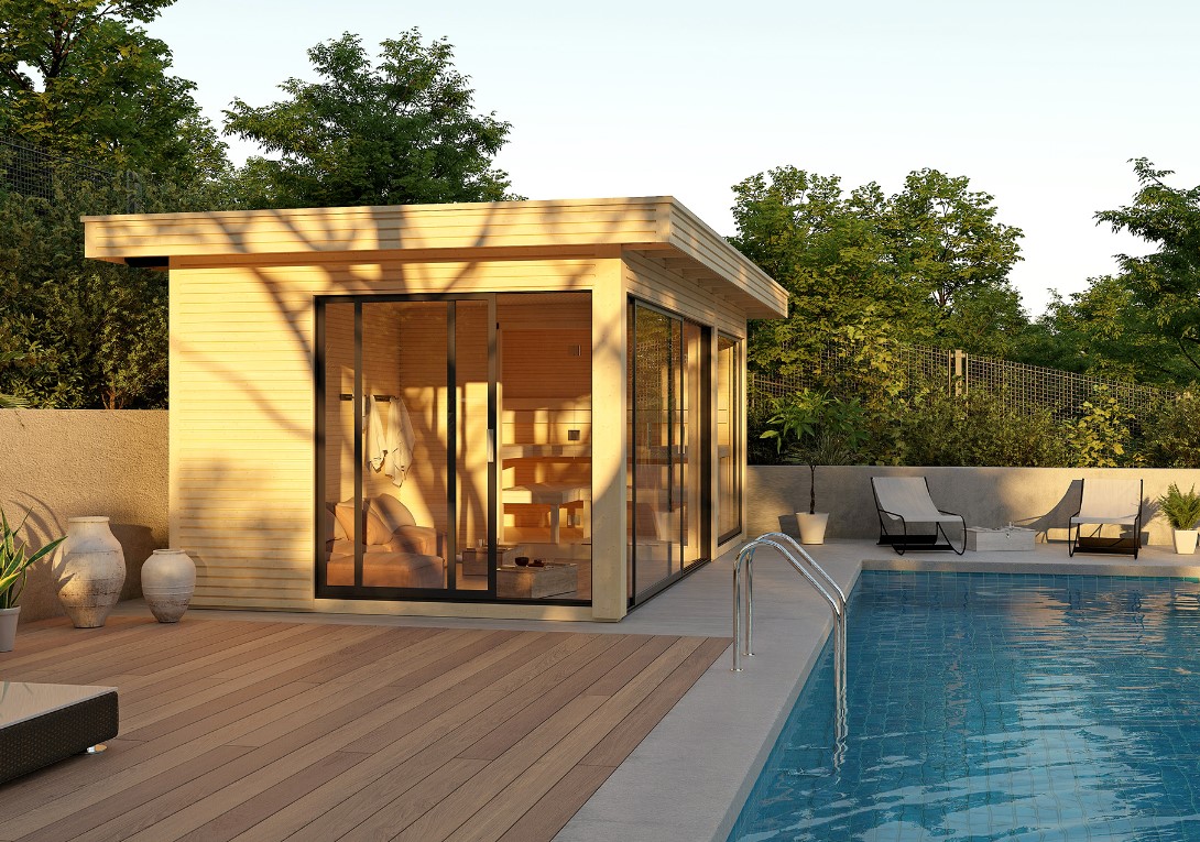 Das Design-Saunahaus LUXE bietet durch seine großen Fensterfronten viel Blickfreiheit in Ihren Garten und weist ein großes Platzangebot vor. Neben der 2 x 3 m Saunakabine befindet sich im Saunahaus ein 3 x 3 m Ruhe- und Aufenthaltsbereich, den Sie ganz nach Ihren wünschen gestalten können. Individuelle Gestaltungsoptionen bieten darüber hinaus die Möglichkeit eine geschlossenere Variante zu Fertigen, die mehr Blickschutz bietet. Da es sich um Individualanfertigungen handelt ist die Lieferzeit dieses Modells auf Anfrage.