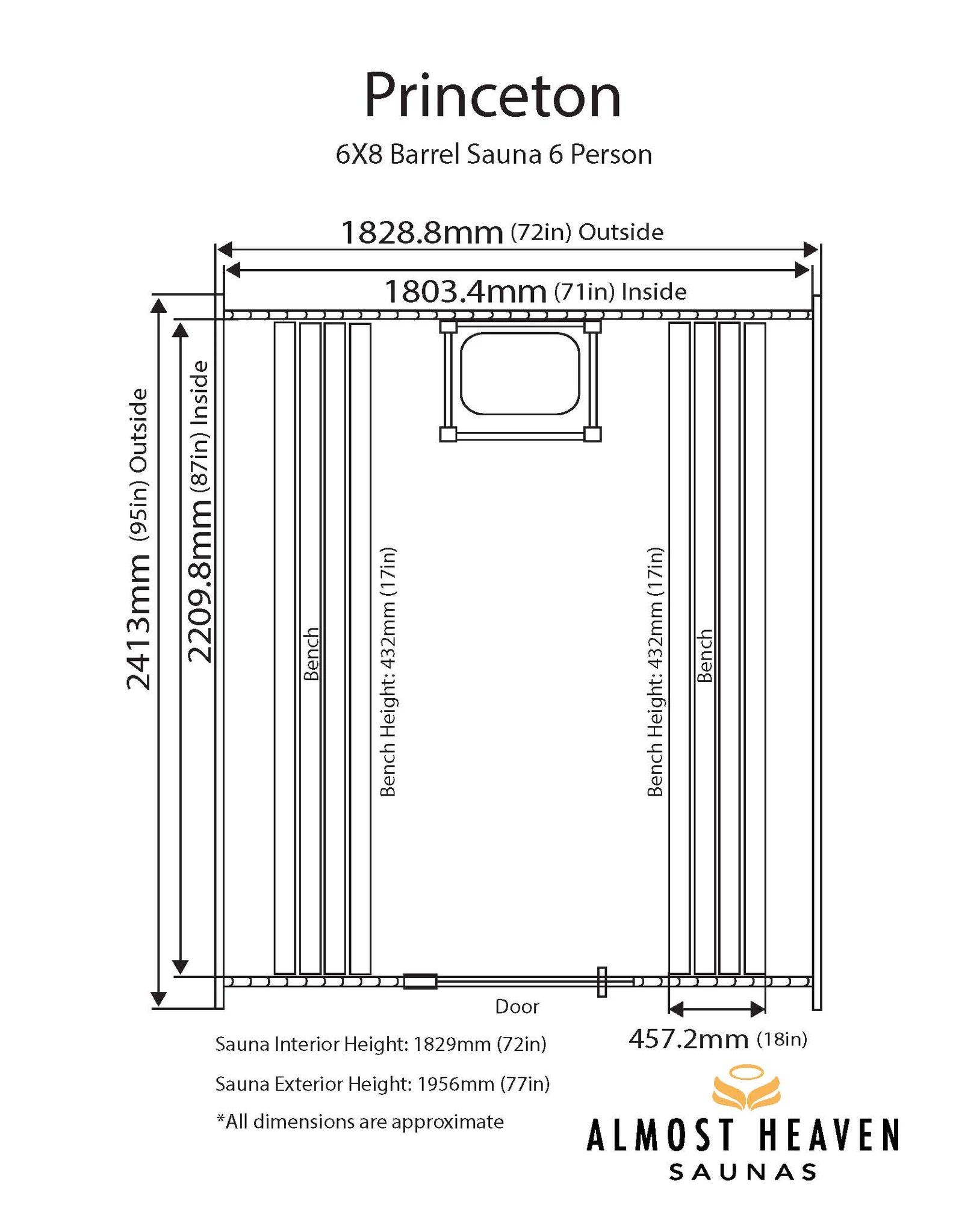Die Fasssauna Princeton aus rustikalem oder klarem Zedernholz ist für 6 Personen geeignet. Die Sauna schafft ein gemütliches Ambiente und einen perfekten Ort zum Entspannen.