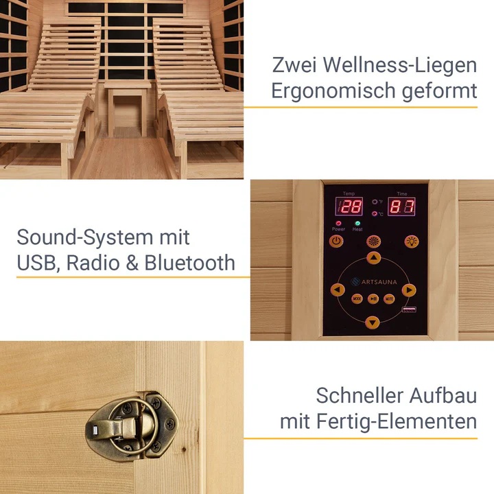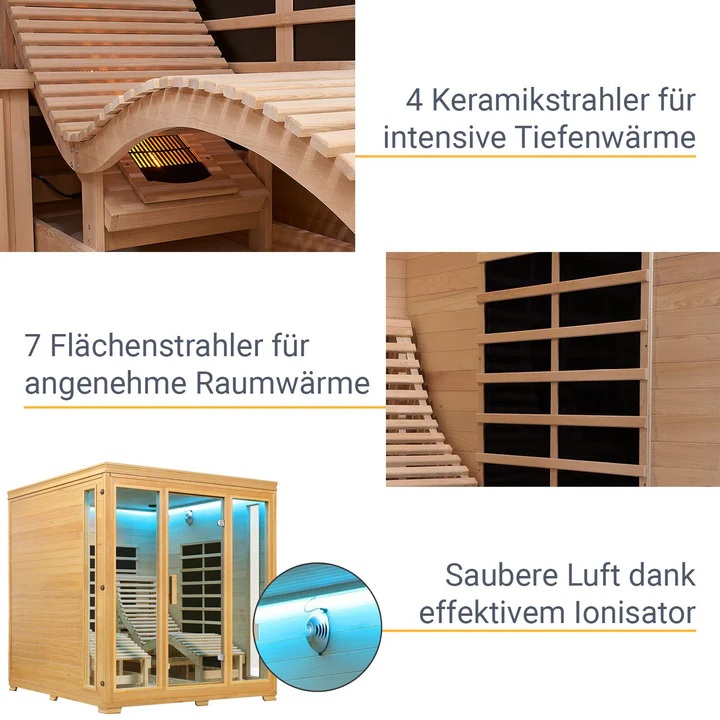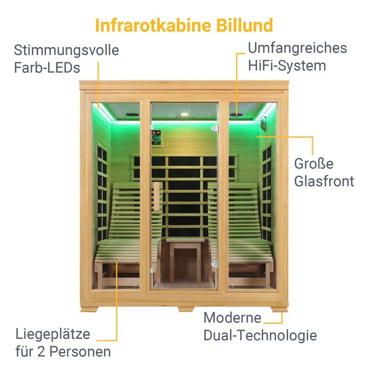 Die Infrarotkabine Billund zählt zu den beliebtesten Wärmekabinen auf dem Markt und überzeugt durch hochwertige Verarbeitung, moderne Technik und ein attraktives Preis-Leistungs-Verhältnis. Mit zwei Relaxliegen, kraftvollen Flächen- und Keramikstrahlern sowie umfangreicher Ausstattung erleben Sie pure Entspannung auf höchstem Niveau.
