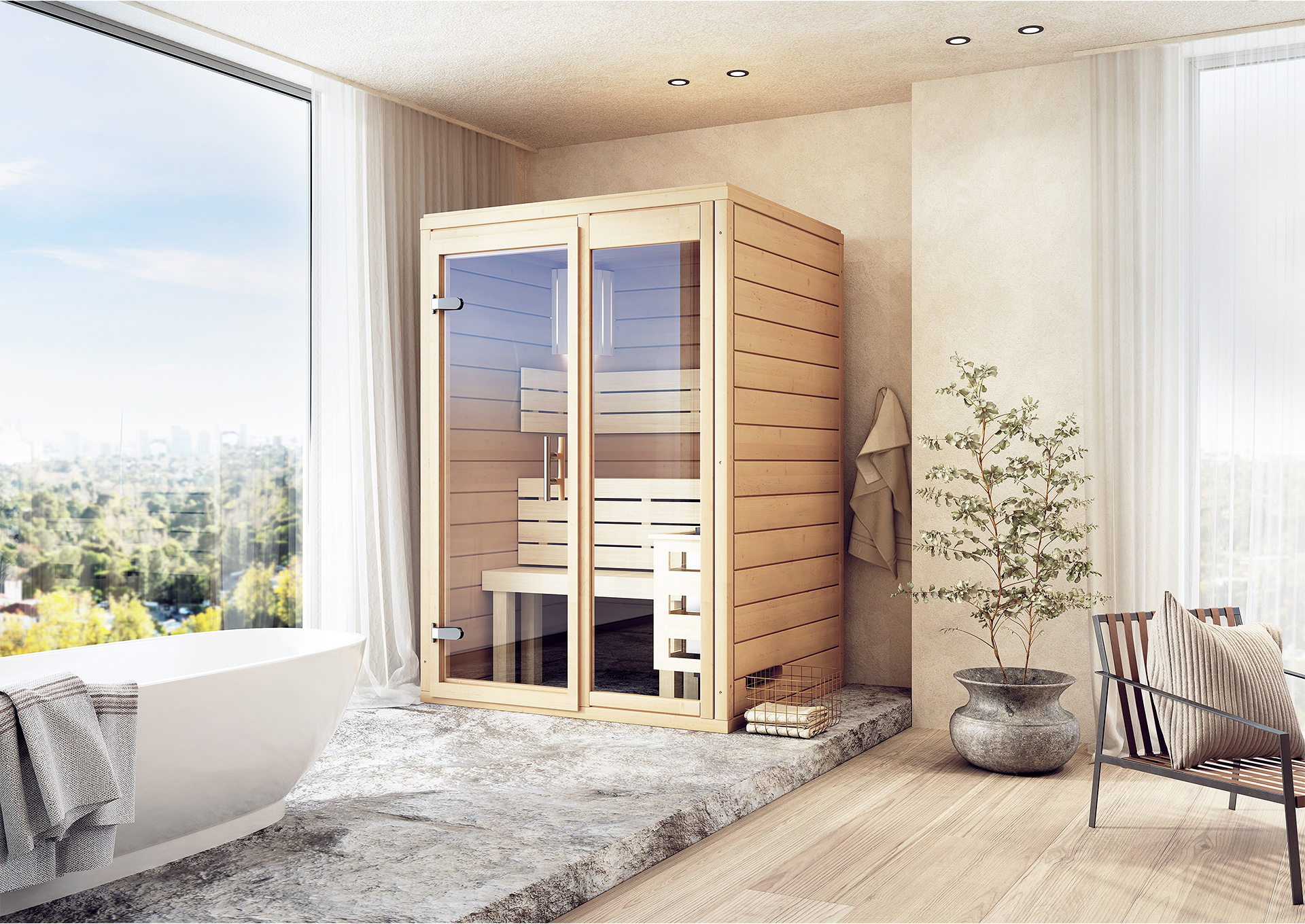 Die Espoo Mini ist eine schlanke, hochwertige Sauna für deine private Wellness-Oase. Mit ihren kompakten 140 × 120 cm (B × T) passt sie nahezu in jede Nische – ideal für kleine Räume.