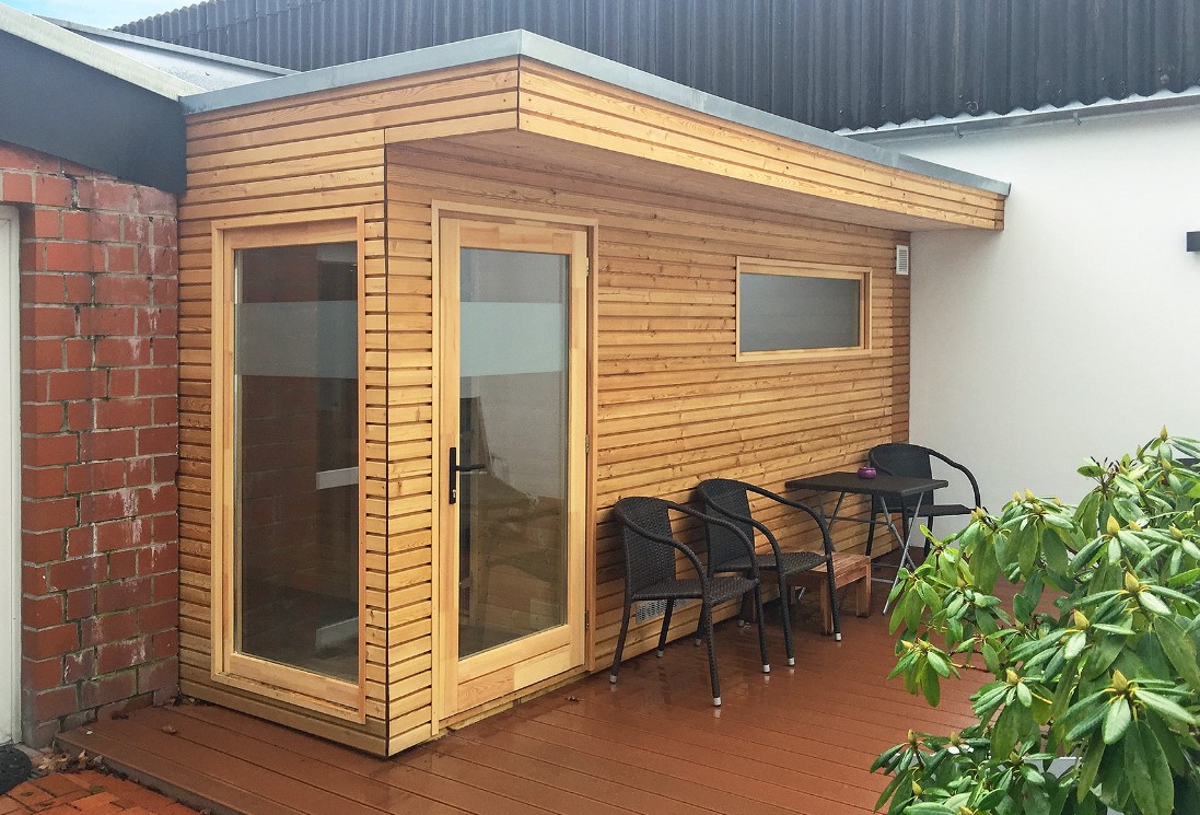- aus 20 mm Nut-und Federdachschalung auf gehobelten (verleimten) Dachsparren, inkl. 77 mm Sauna-Zwischendeckenstärke, stabile vormontierte Rahmenkonstruktion mit Steinwollplatten und starker Alufolie. Innen mit 16 mm Softline Saunaprofilholz verkleidet. (Ohne Dacheindeckung)