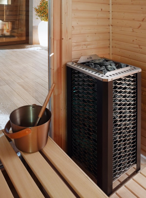 - Zubehörbox: Saunakübel mit Kunststoffeinsatz, Holzkelle, Sanduhr und Klimamesser