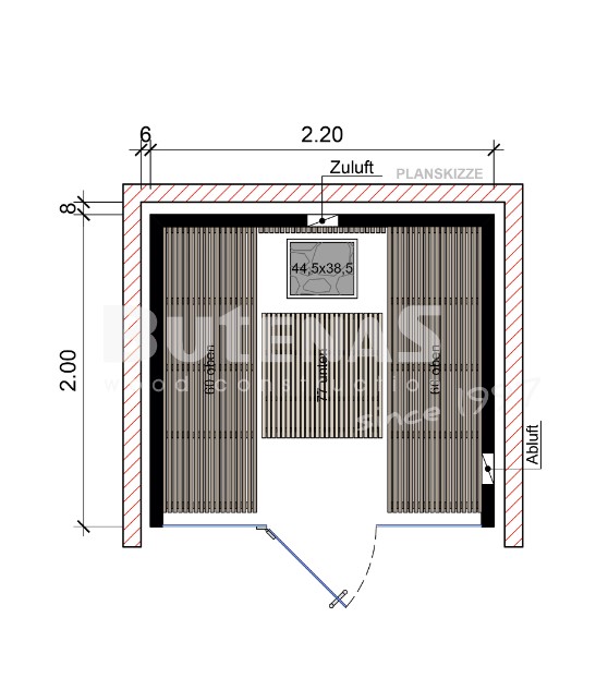 - Sauna-Maßeangaben (BxTxH): 2,20 m x 2,00 m x 2,10 m