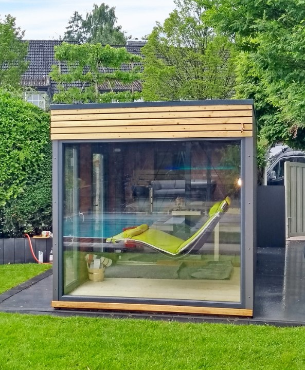 - ca. 140 mm Rahmenkonstruktion mit eingebauter Dämmung aus standfester Steinwolle mit innenliegender Dampfsperre, aus Aluminium-Folie, auf Sockelkonstruktion