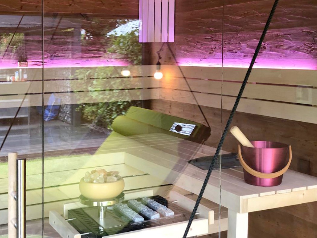 - Saunatür 10 mm ESG Glasfront mit schwellenloser Tür und Stangentürgriff