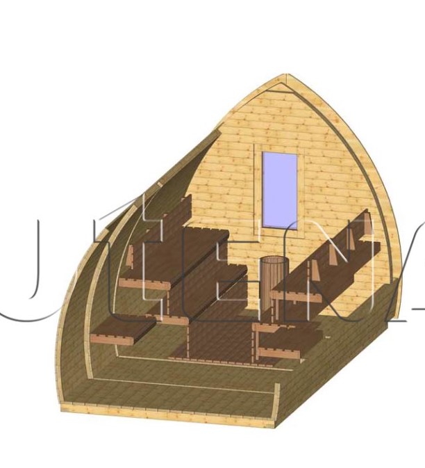 - in 81 mm Wandstärke, vormontierte Rahmenkonstruktion mit zusätzlichen Querprofilen zur Ausbildung von mehreren Wärmedämmschotten. Diese dienen der Unterbindung von Materialschwund in der eingebauten Dämmung aus Steinwolle mit innenliegender Dampfsperre aus Aluminium-Folie, auf Sockelkonstruktion. Innenvertäfelung 16 mm Saunaprofilholz aus Polarfichte, in speziellem Softline-Profil. Außenverkleidung 20 mm Profilholz