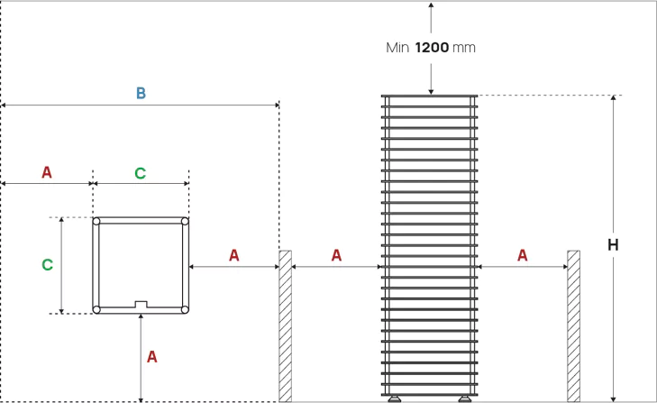 - Sicherheitsabstände: A 240 mm | B 750 mm | C 270 mm | H 975 mm