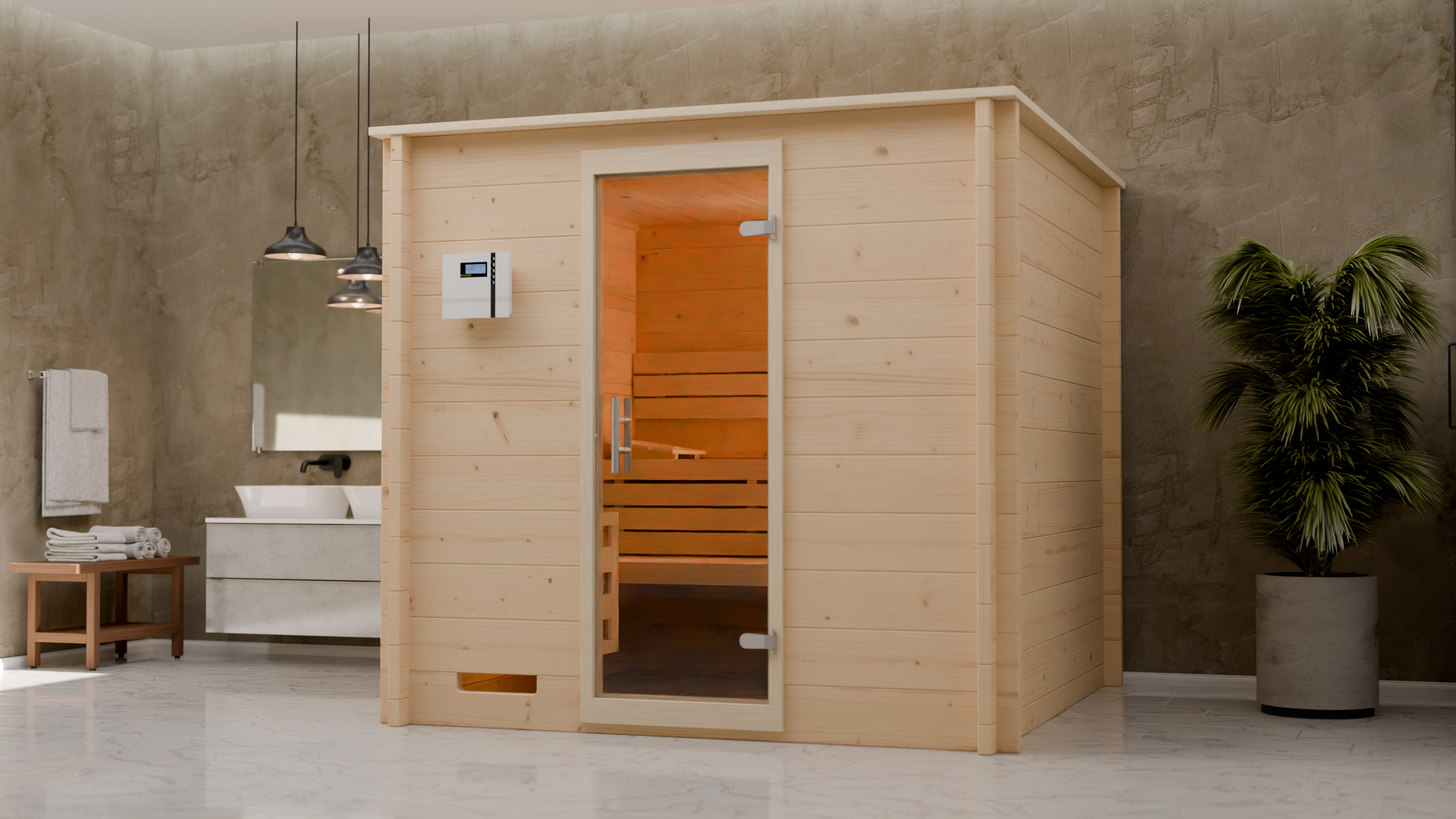 - 6–9 kW Saunaofen (optimale Leistung an Größe angepasst)