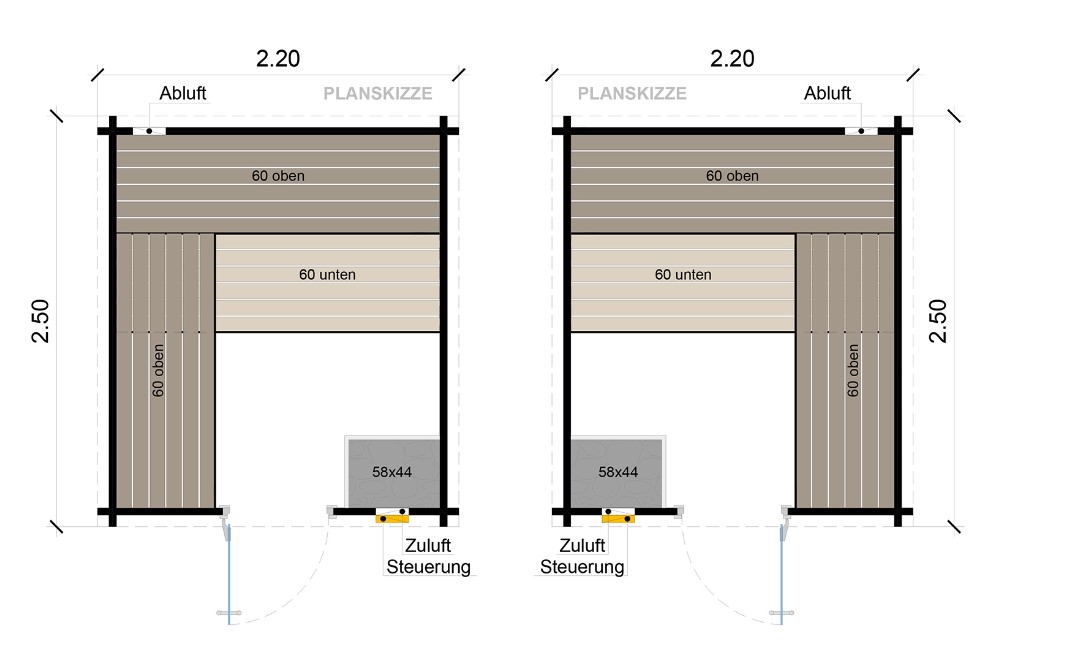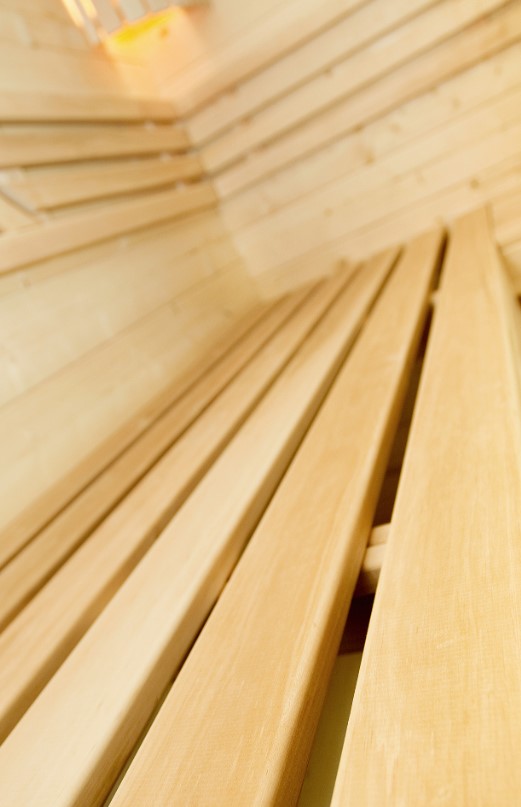- 2–3 Saunaliegen (je nach Größe), untere Liege verschiebbar
