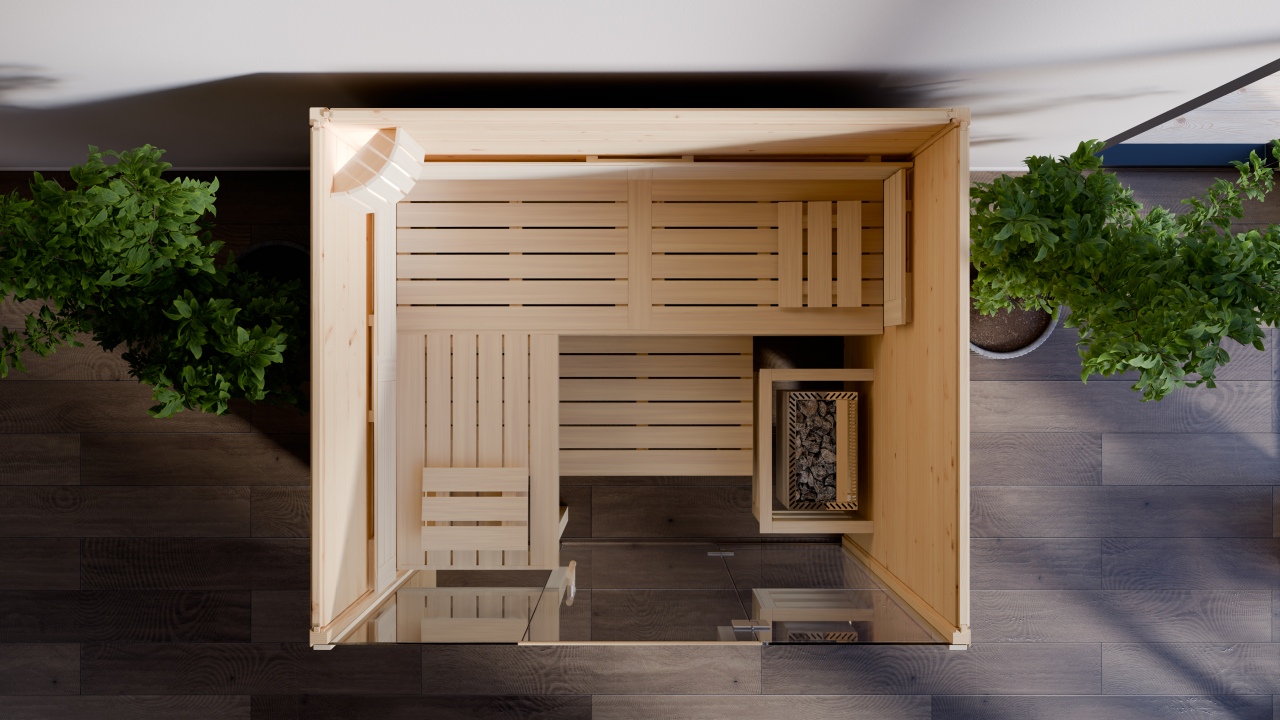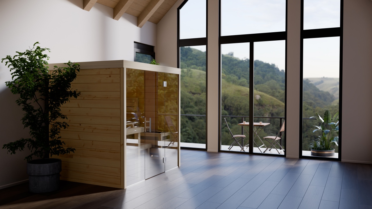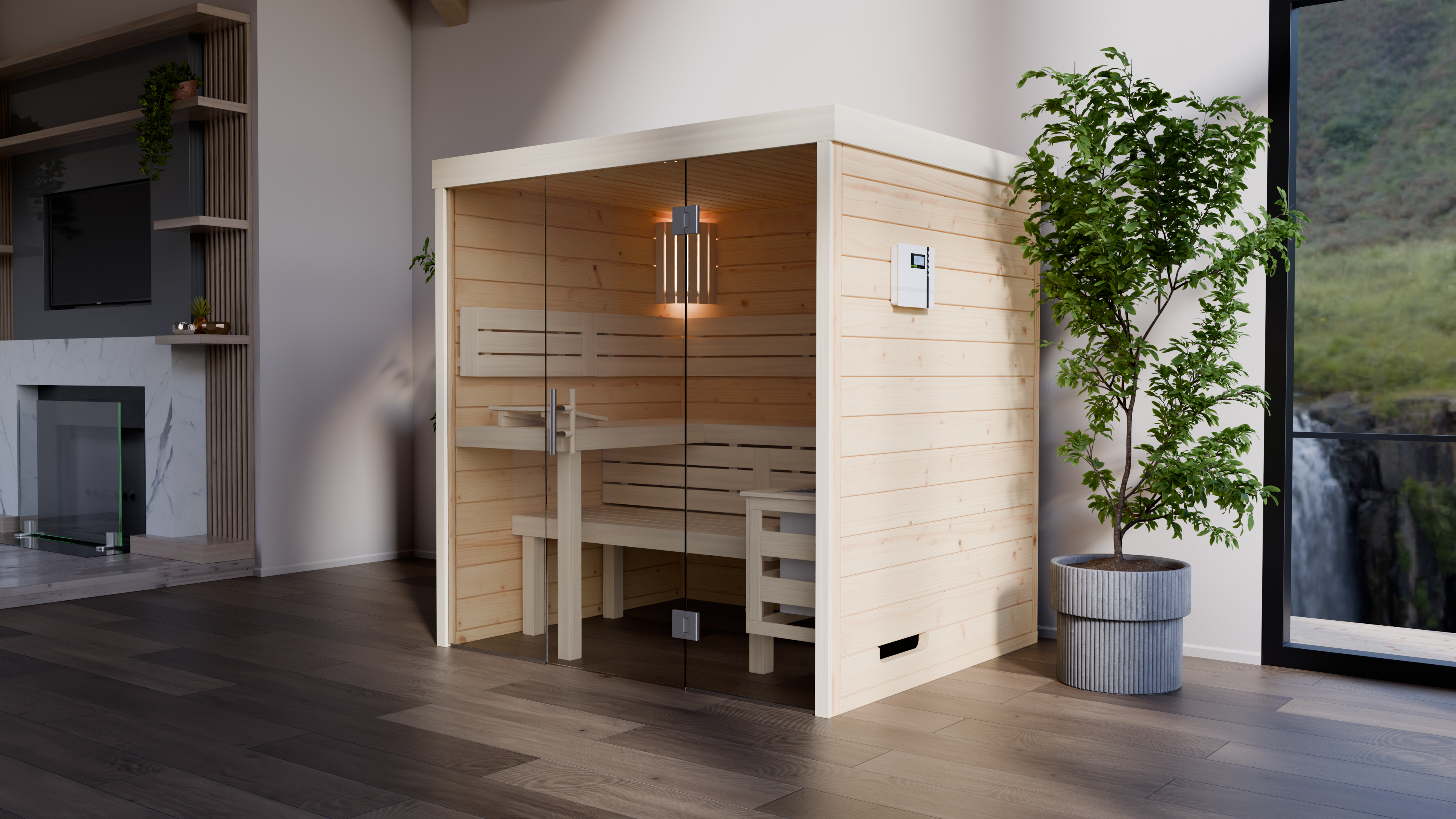 Die Massivholz-Sauna LYA ist in drei Größen erhältlich und überzeugt durch ihre edle Glasfront, hochwertige Verarbeitung und ein angenehmes Saunaklima. Ideal für alle, die Qualität, Komfort und modernes Design miteinander verbinden möchten.
