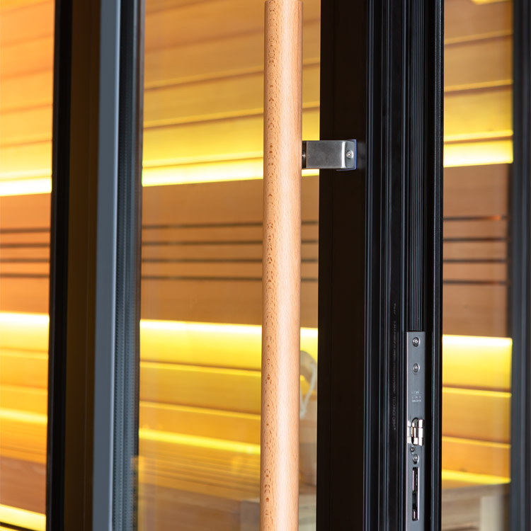 Ein echtes Highlight ist die großzügige Fensterfront mit 27 mm starkem 2-fach Isolierglas (6 + 15 Ar + 6). Sie sorgt für ein offenes Raumgefühl und hält gleichzeitig die Wärme zuverlässig in der Sauna.
